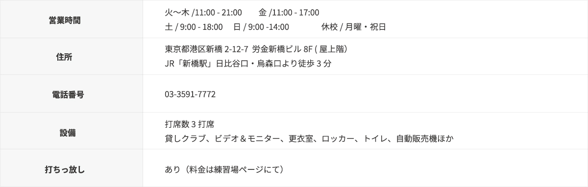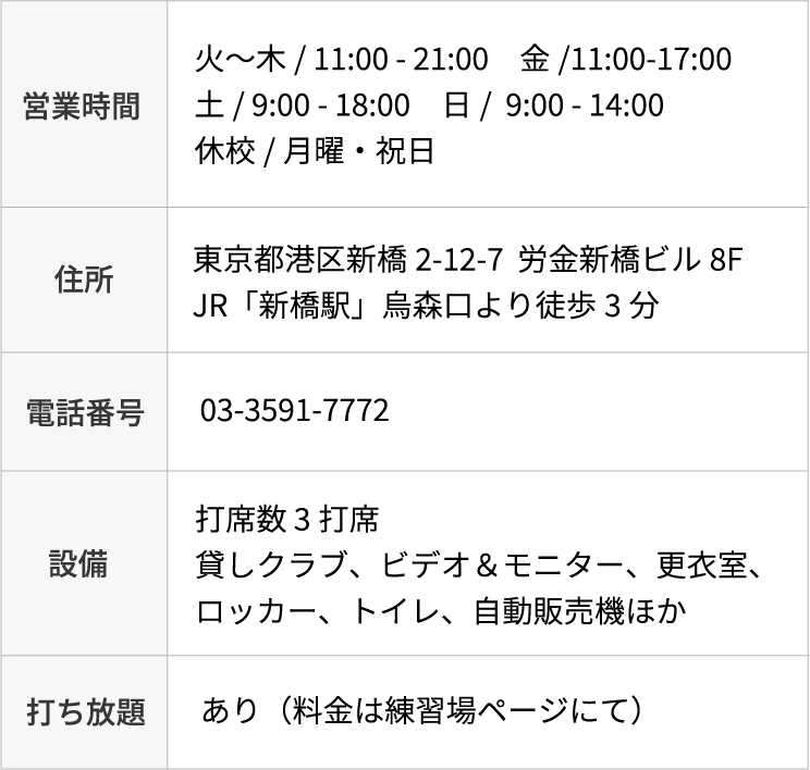 新橋駅から徒歩3分なので通いやすく、周りにはオフィスビルや飲食店が立ち並んでいます。 ゆったりと打席スペースを確保しているので、 都心にいながらもリフレッシュ出来ます。 ゴルフ経験者の方も、未経験者の方も安心して通っていただけます。